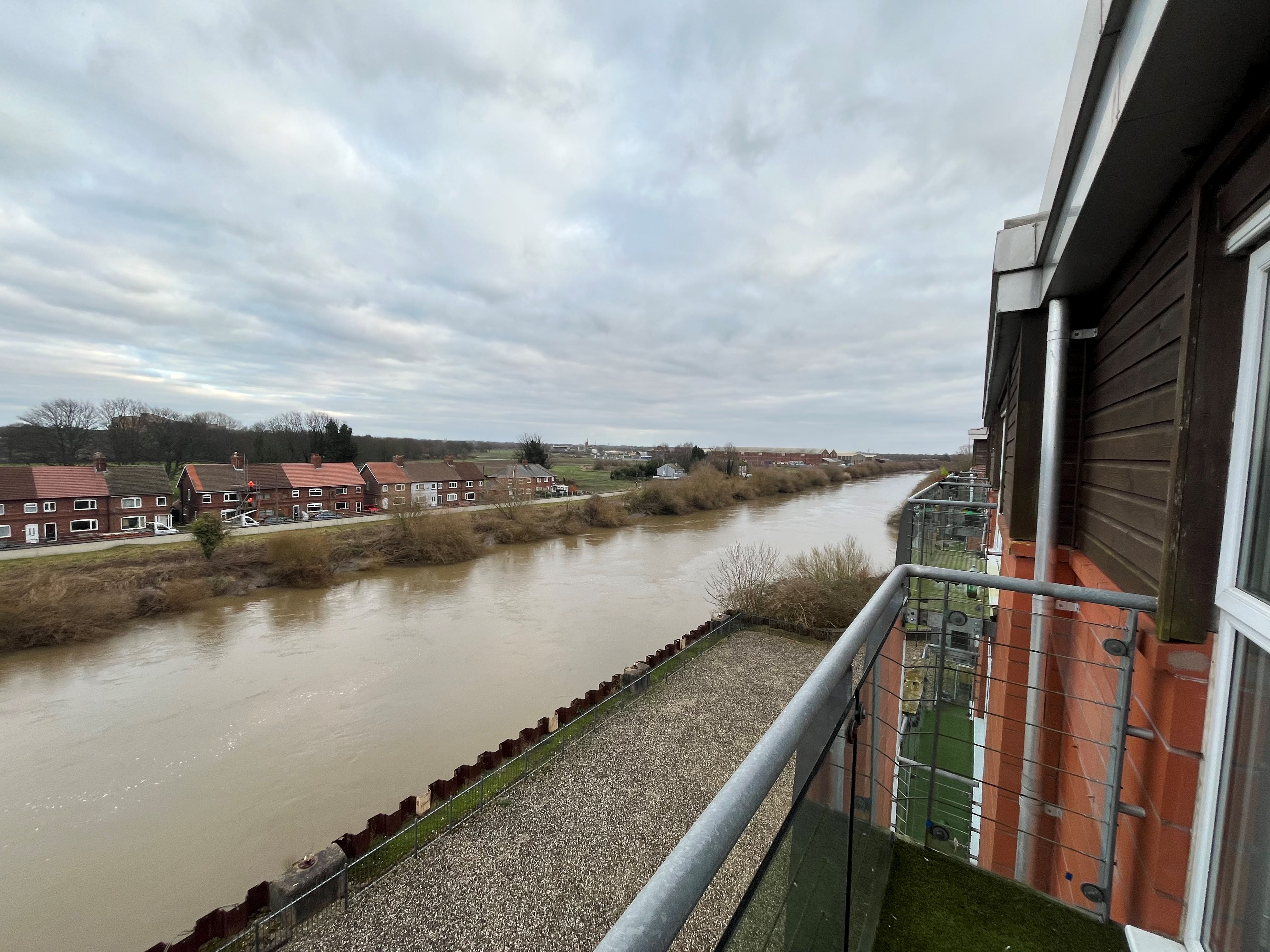 Internally, the flat is arranged with an open plan living room and kitchen finished with vinyl flooring, modern wooden kitchen wall and base units with inset stainless steel sink and tile splashback. The living area provides carpet flooring, painted plaster walls and LED spotlights. The living room accommodation provides UPVC double glazed patio doors opening on to a balcony overlooking the River Ouse to rear of the property. The bedrooms are consistent in specification with the master bedroom being slightly larger and providing in-built wardrobe storage. The bathroom provides a bath with overhead shower, WC and sink basin.