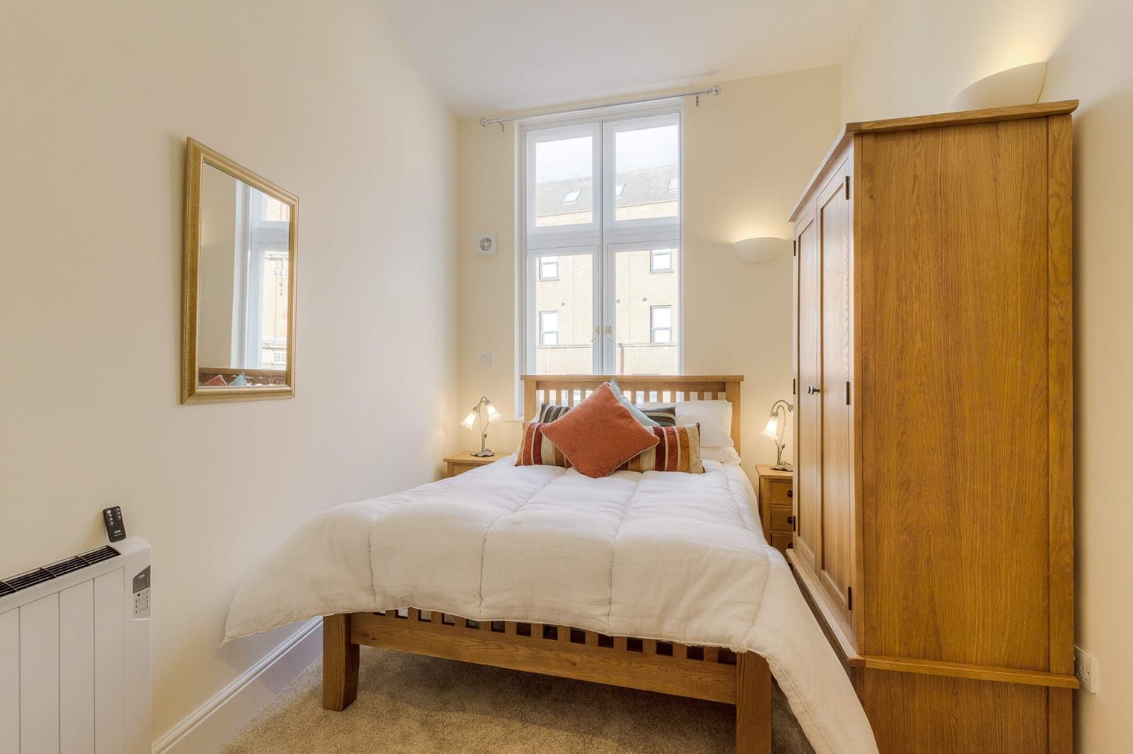 The second bedroom has a front-facing window with secondary glazing, an exposed beam and support structure, and an electric panel heater. Its en-suite bathroom is also fully tiled and includes a walk-in shower cubicle, low-level WC, and pedestal wash basin.