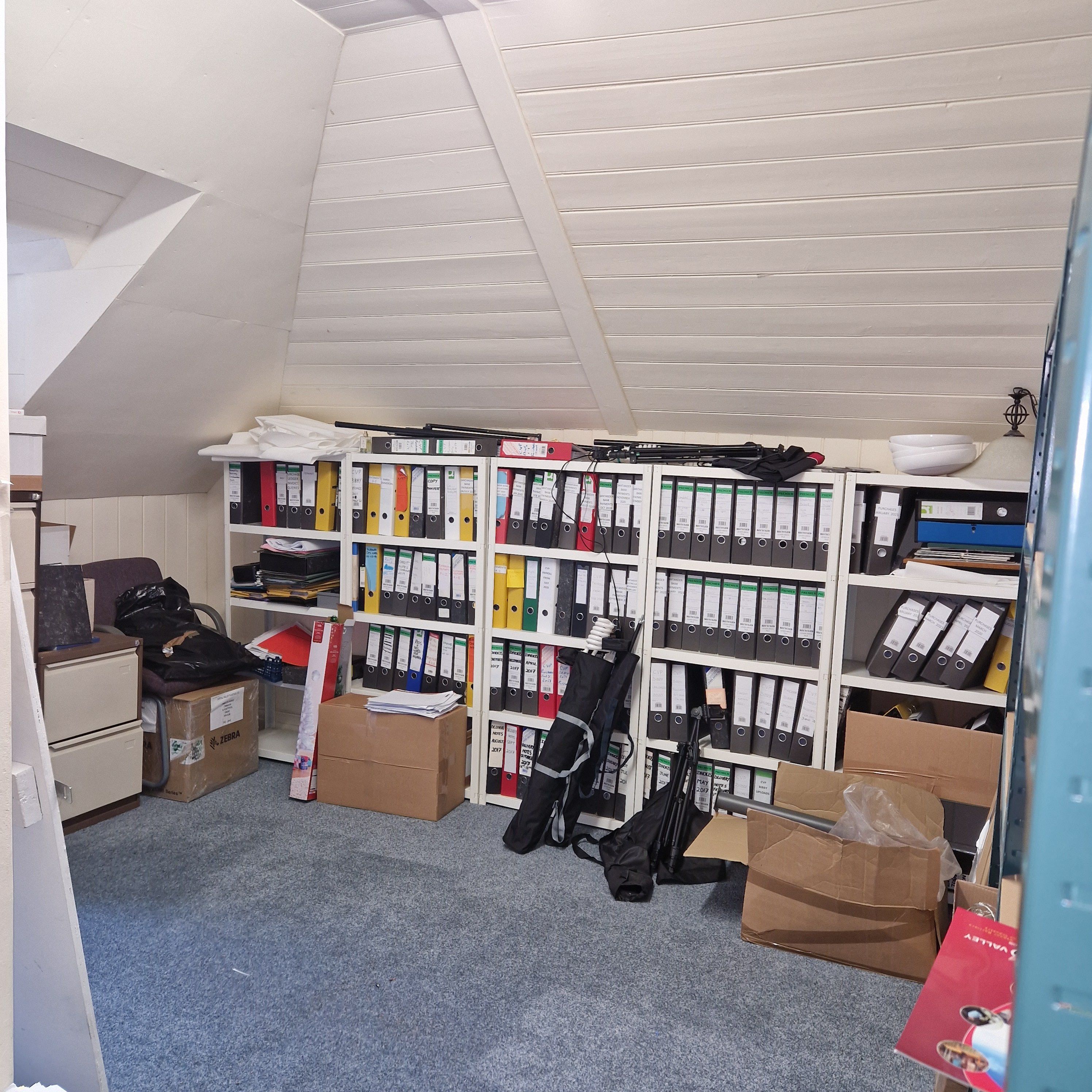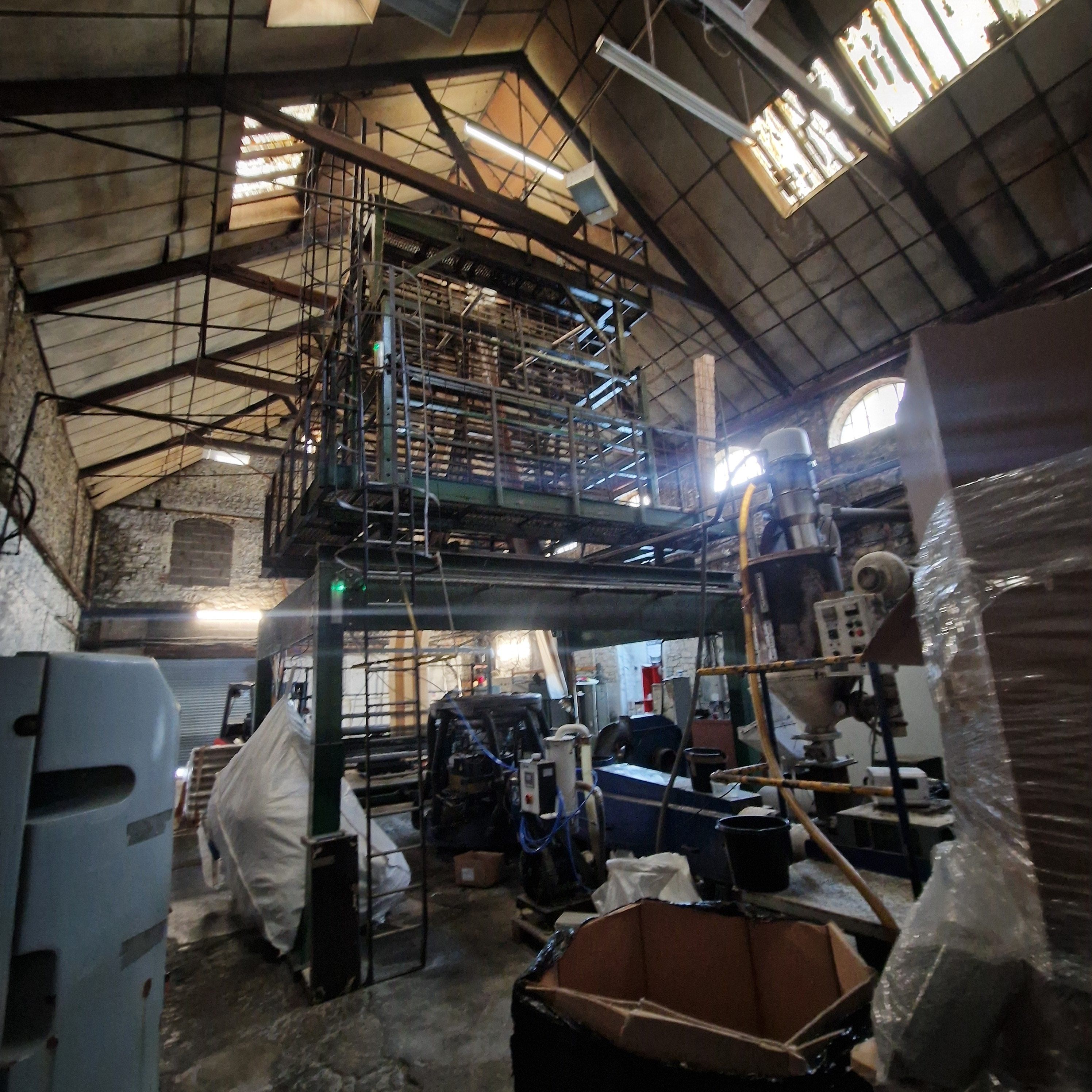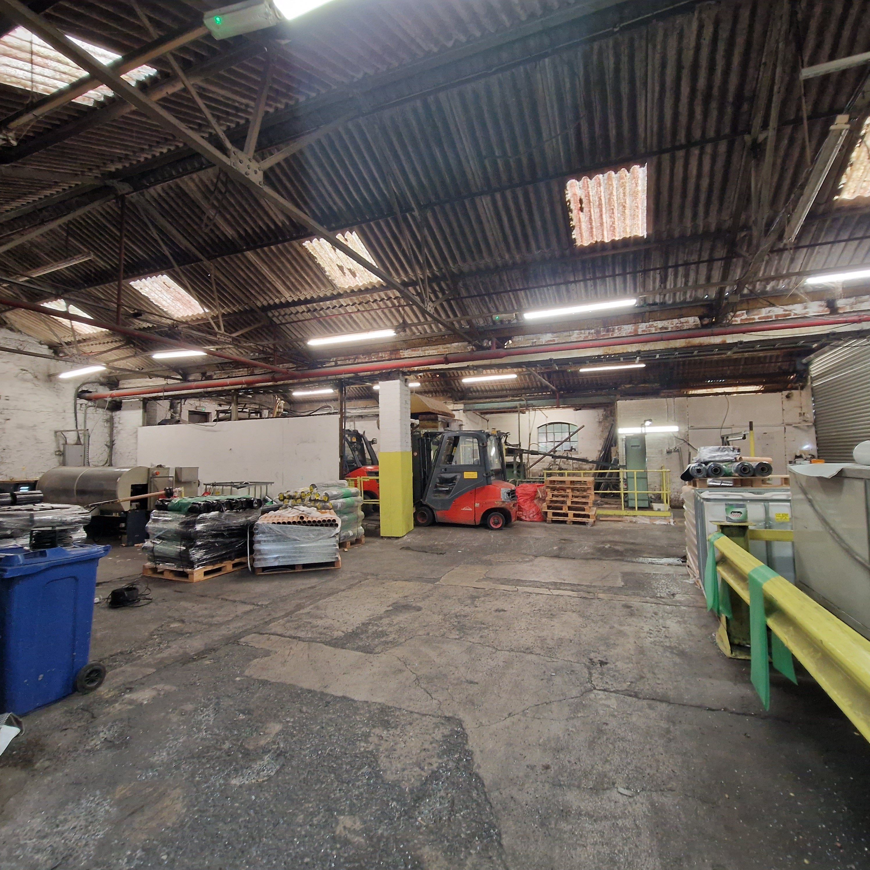 Comprises a detached stone-built former production area. The internal layout has been divided into three workshop spaces. The building features corrugated roofing with transparent panels, strip lighting, and a concrete floor.