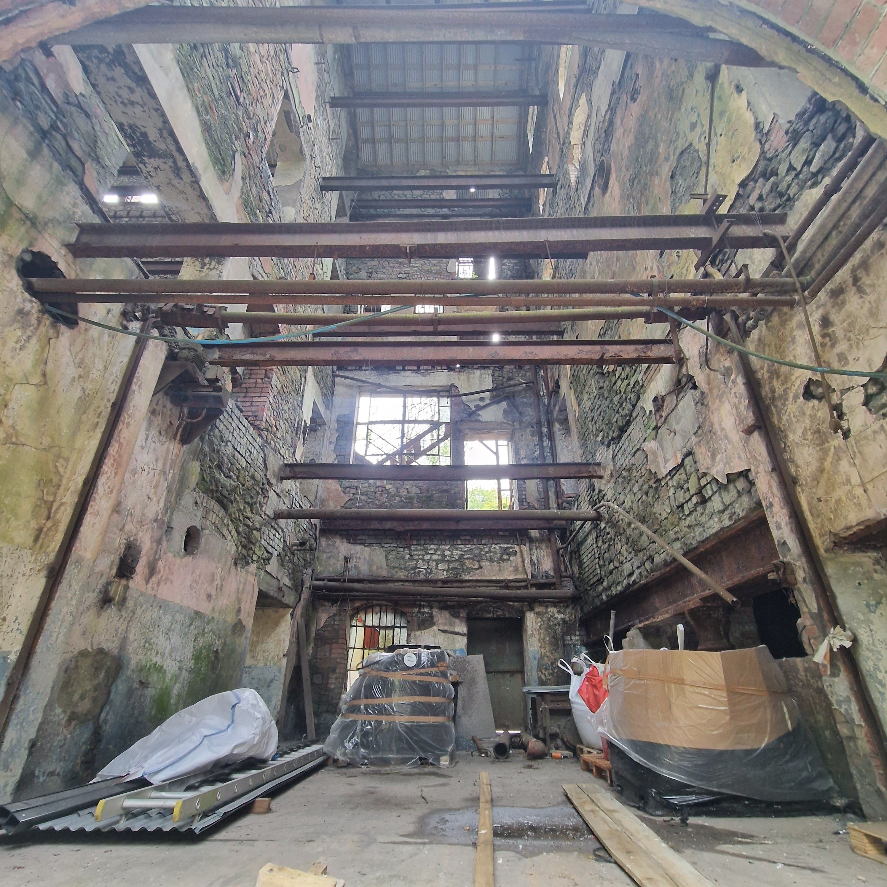 Comprises a Grade II listed substantial building with both five storey and two storey elements. The building sustained fire damage in 2010 and provides five workshop areas. Recent works have been completed to install a new roof over part of the structure. The building remains in a derelict condition.