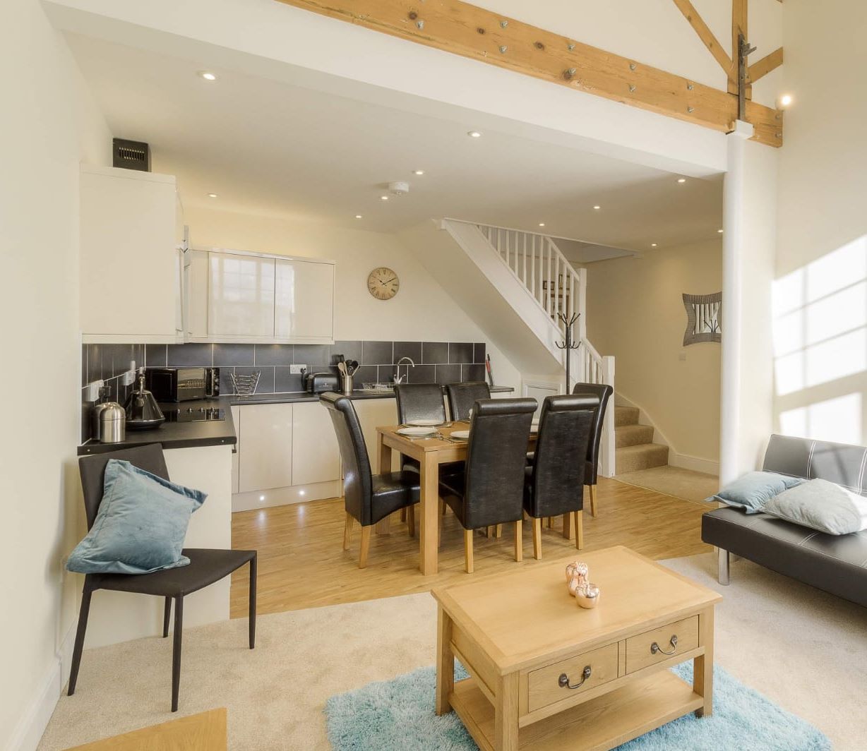 The lounge and kitchen are open-plan. The kitchen is fitted with wall and base units, roll-top work surfaces, and integrated appliances, including a Bosch electric oven, hob with extractor, Beko dishwasher, Beko washing machine, and stainless steel sink unit with drainer. There is an understairs cupboard and stairs leading to the mezzanine bedroom. Exposed beams are present in some areas.