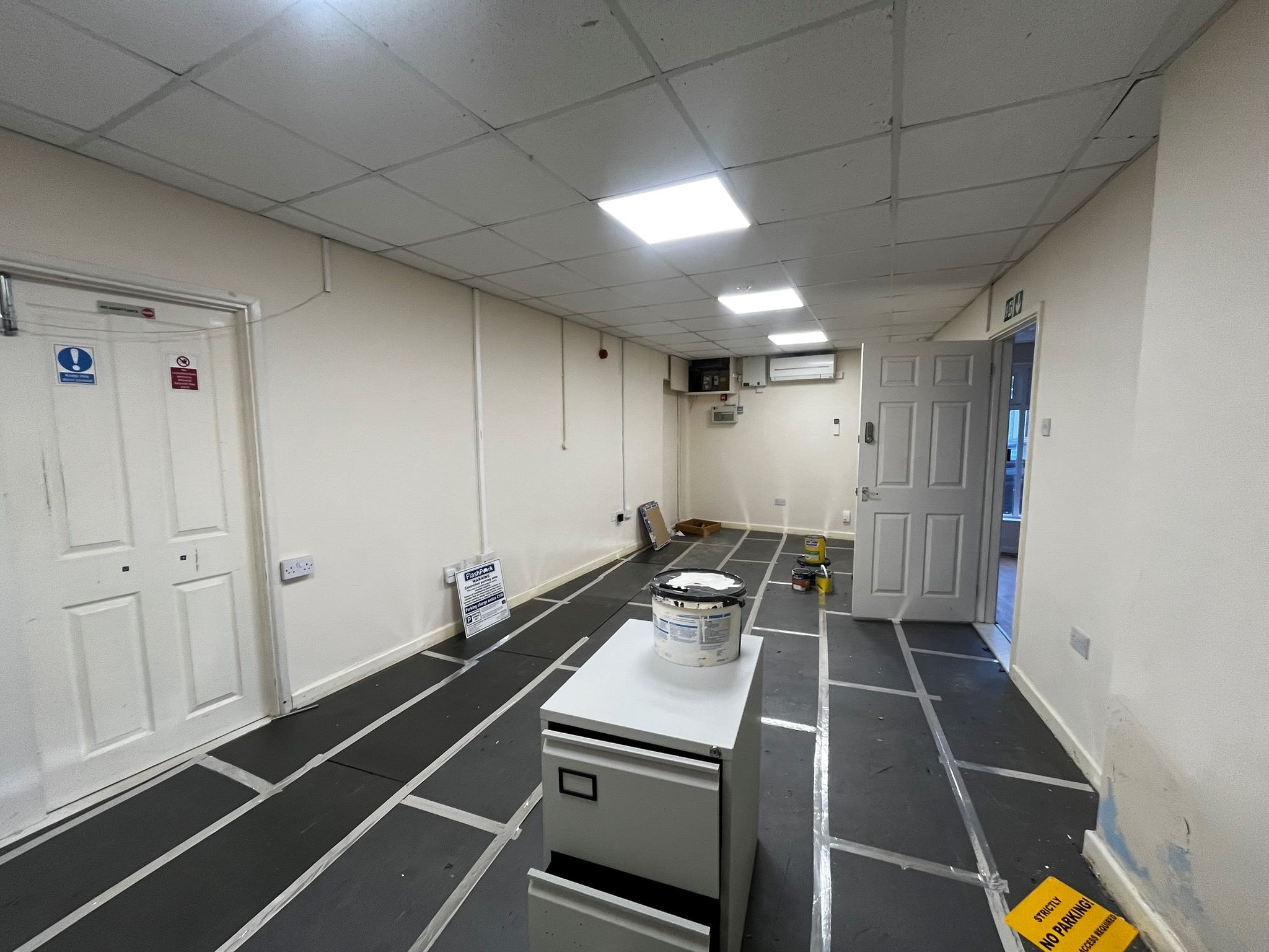 The residential element is arranged over two floors. The ground floor provides a living room, while the first floor includes two bedrooms, a kitchen with utility area (which offers access to a flat roof), and a bathroom/WC. Access to the residential accommodation is via a private entrance on Cromwell Road.