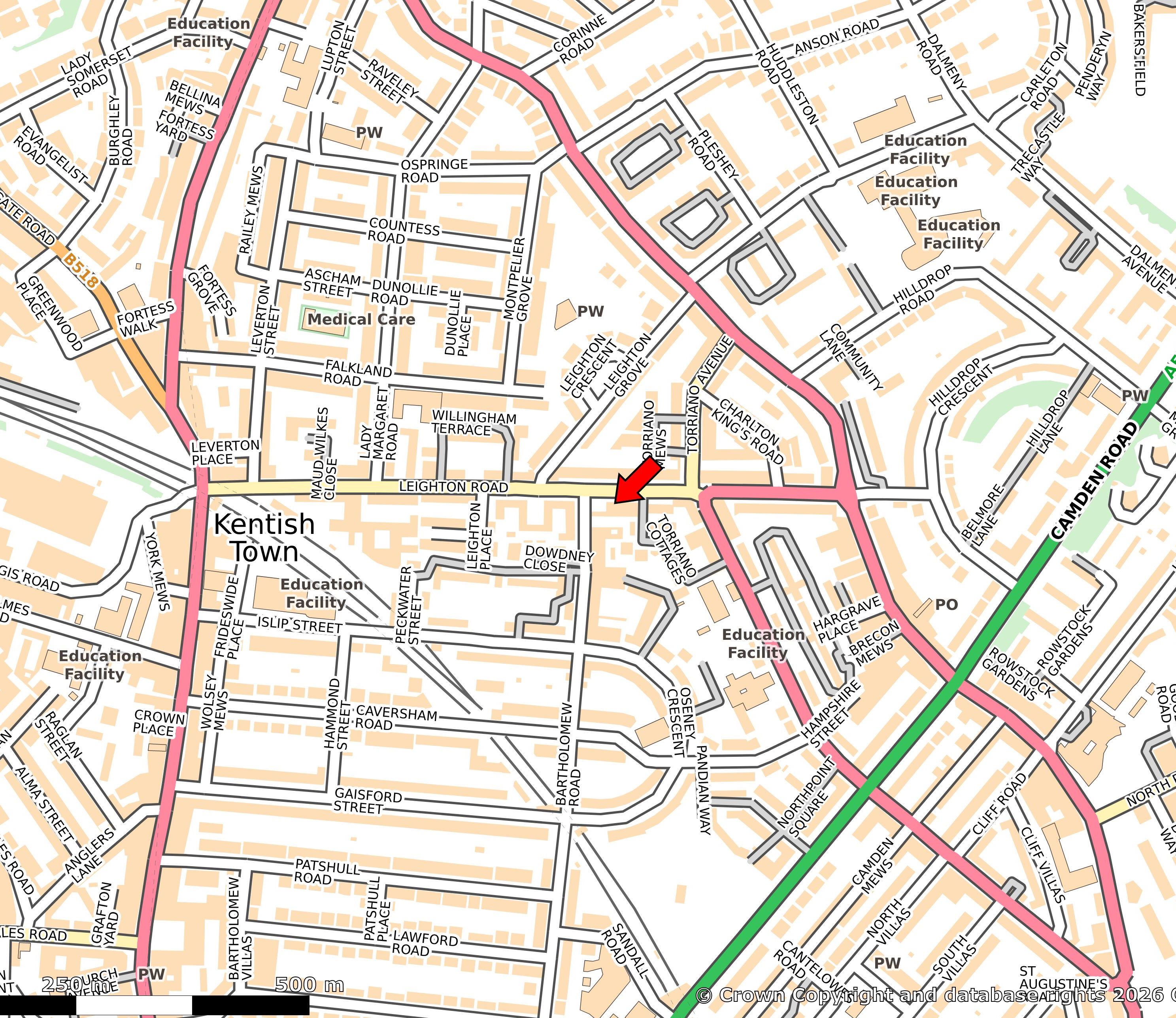 The property is situated on Leighton Road in the London Borough of Camden (NW5), approximately 0.3 miles from Kentish Town Underground Station (Northern Line) and Kentish Town Thameslink Station, providing direct connections to Central London and beyond.