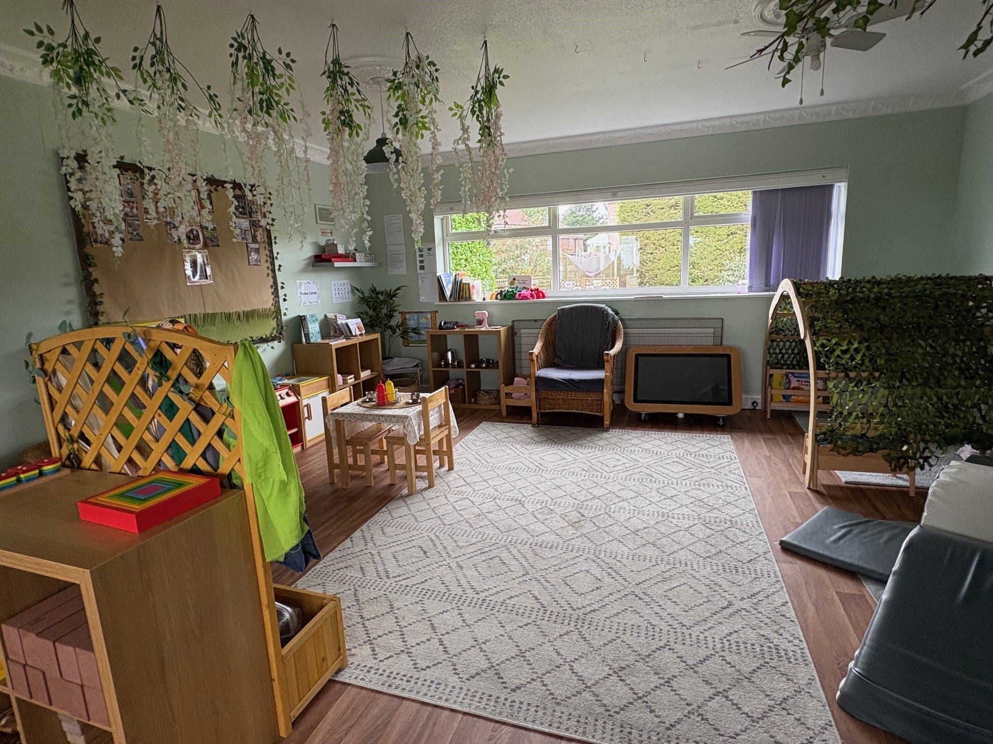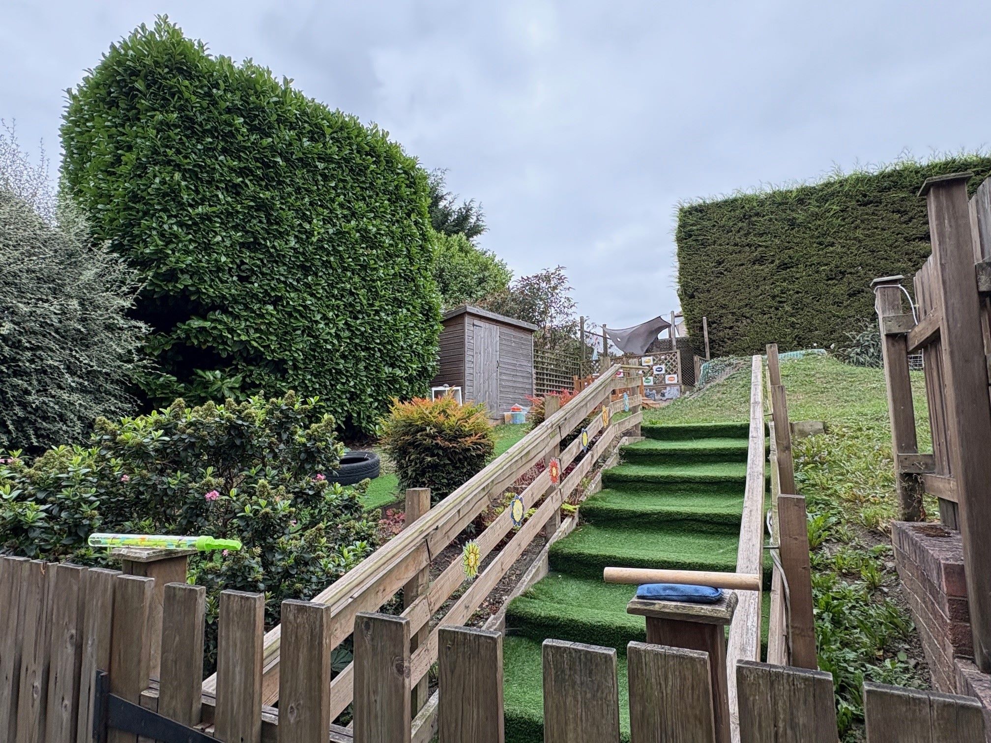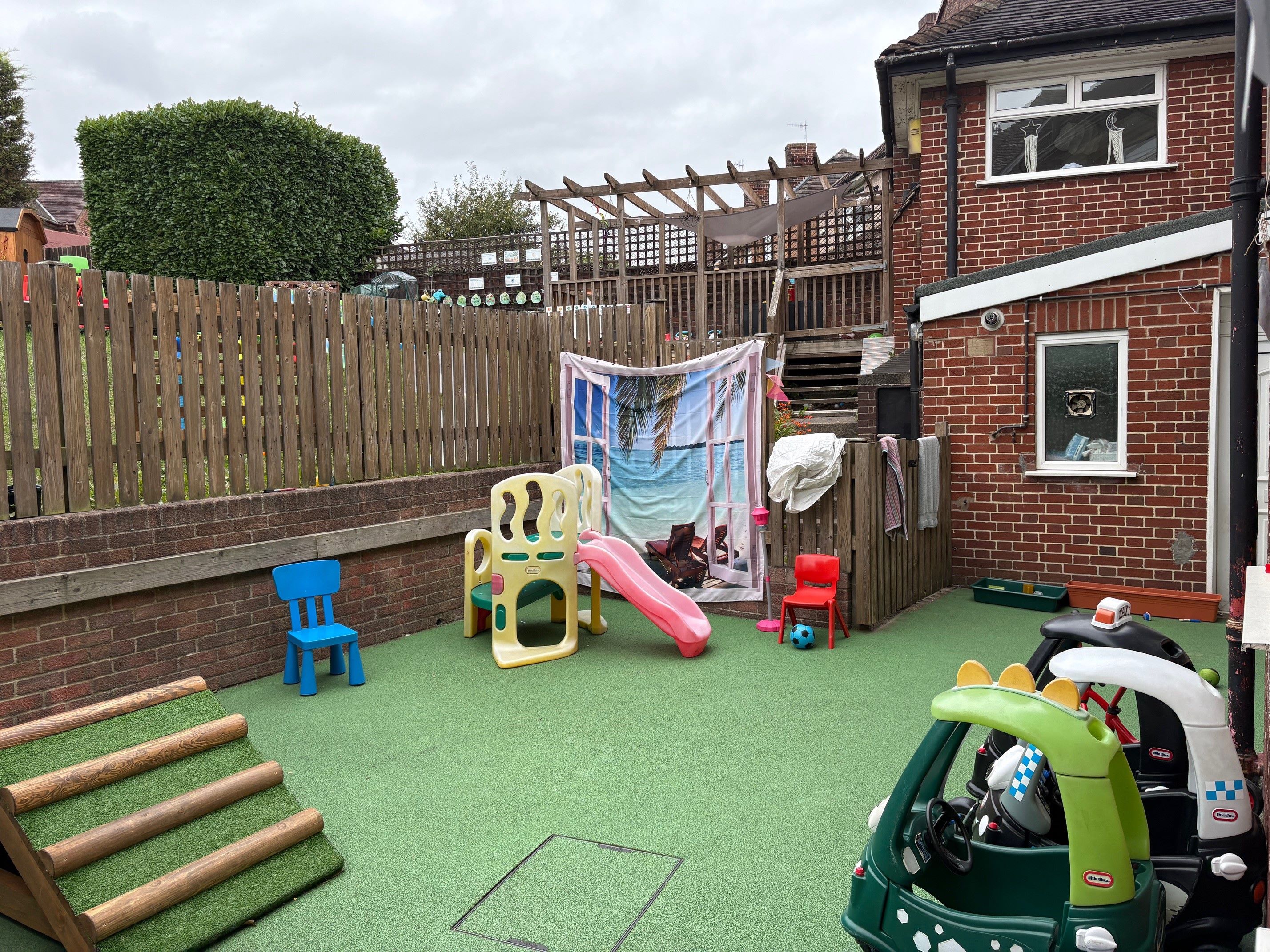 To the rear, there is a dedicated children’s play area surfaced with artificial grass (Astro-turf), enclosed by soft landscaping and a grassed area behind a timber picket fence.