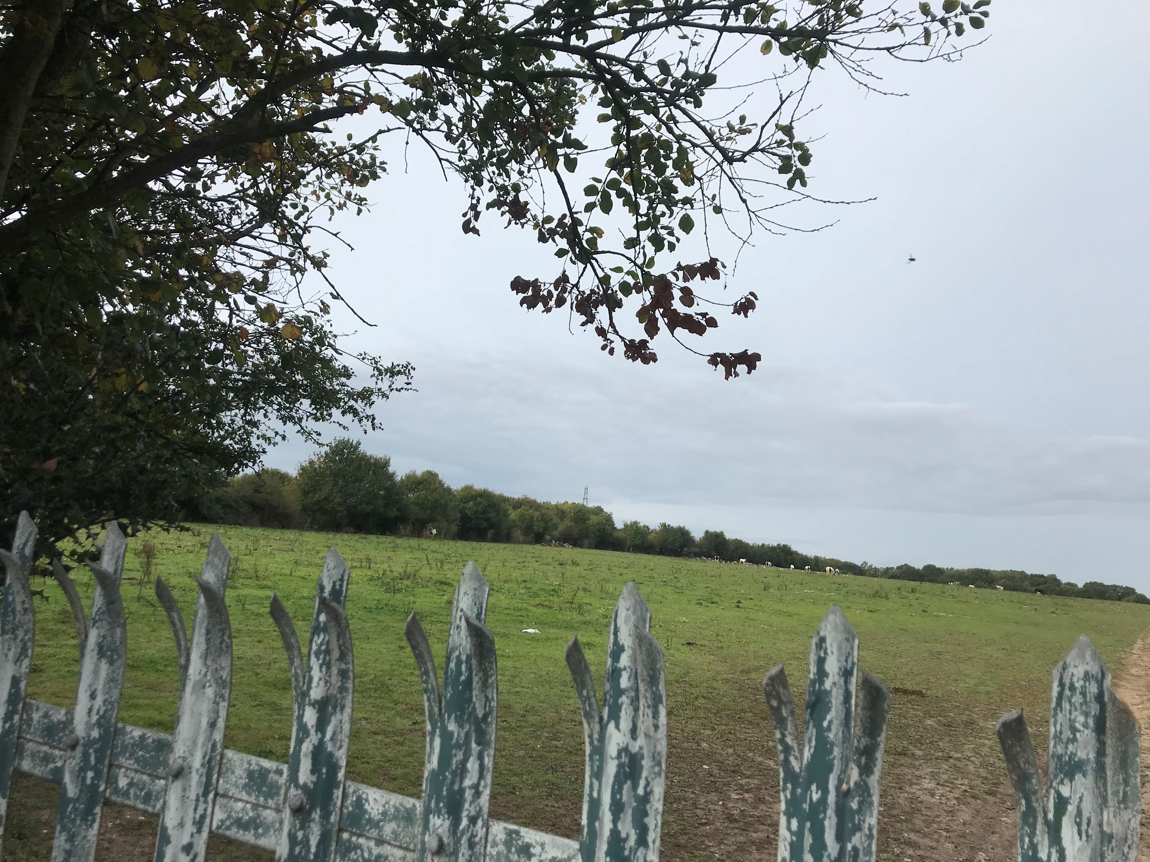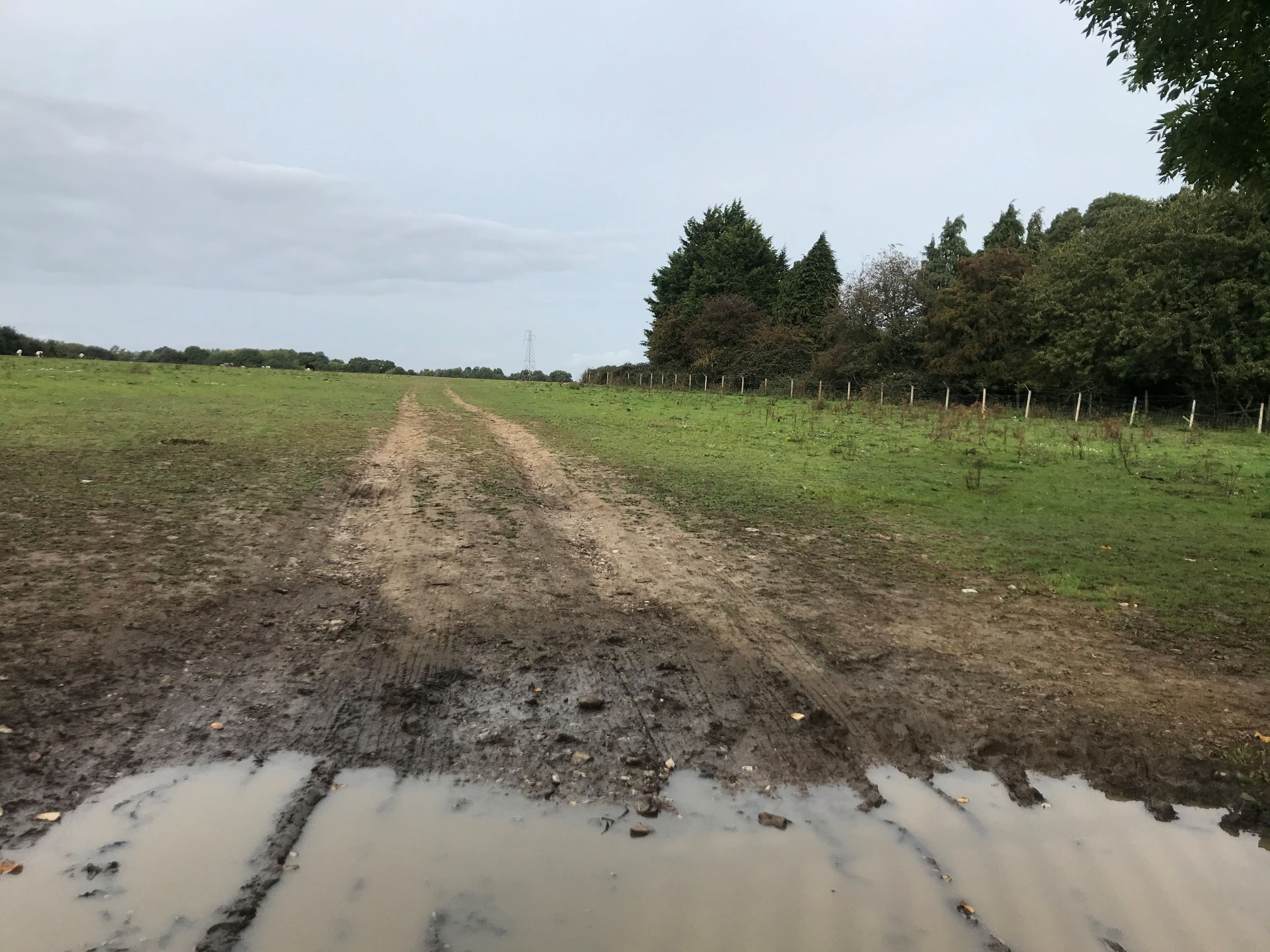 A national grid electricity line crosses the field, with a single pylon situated within the field.