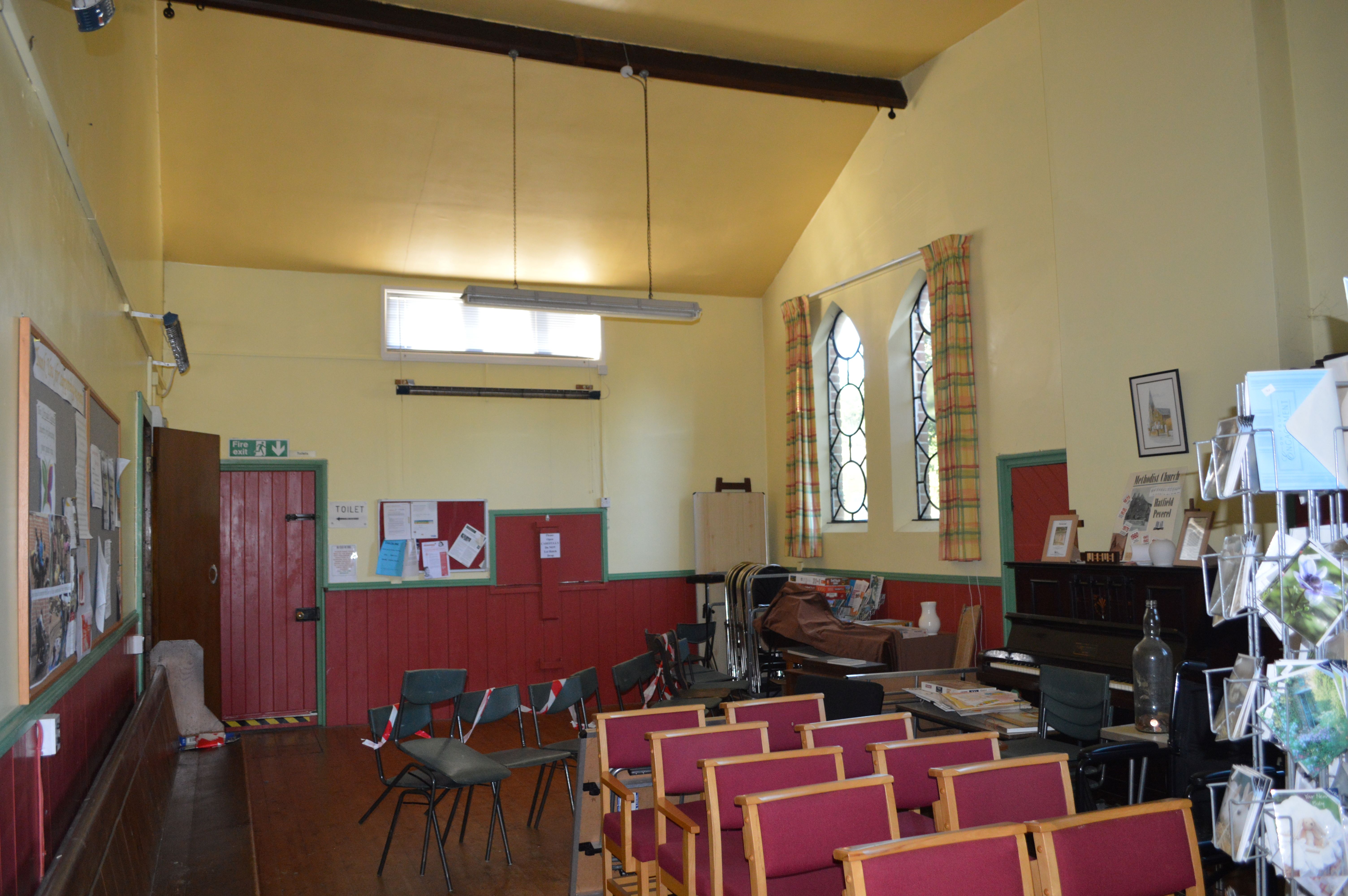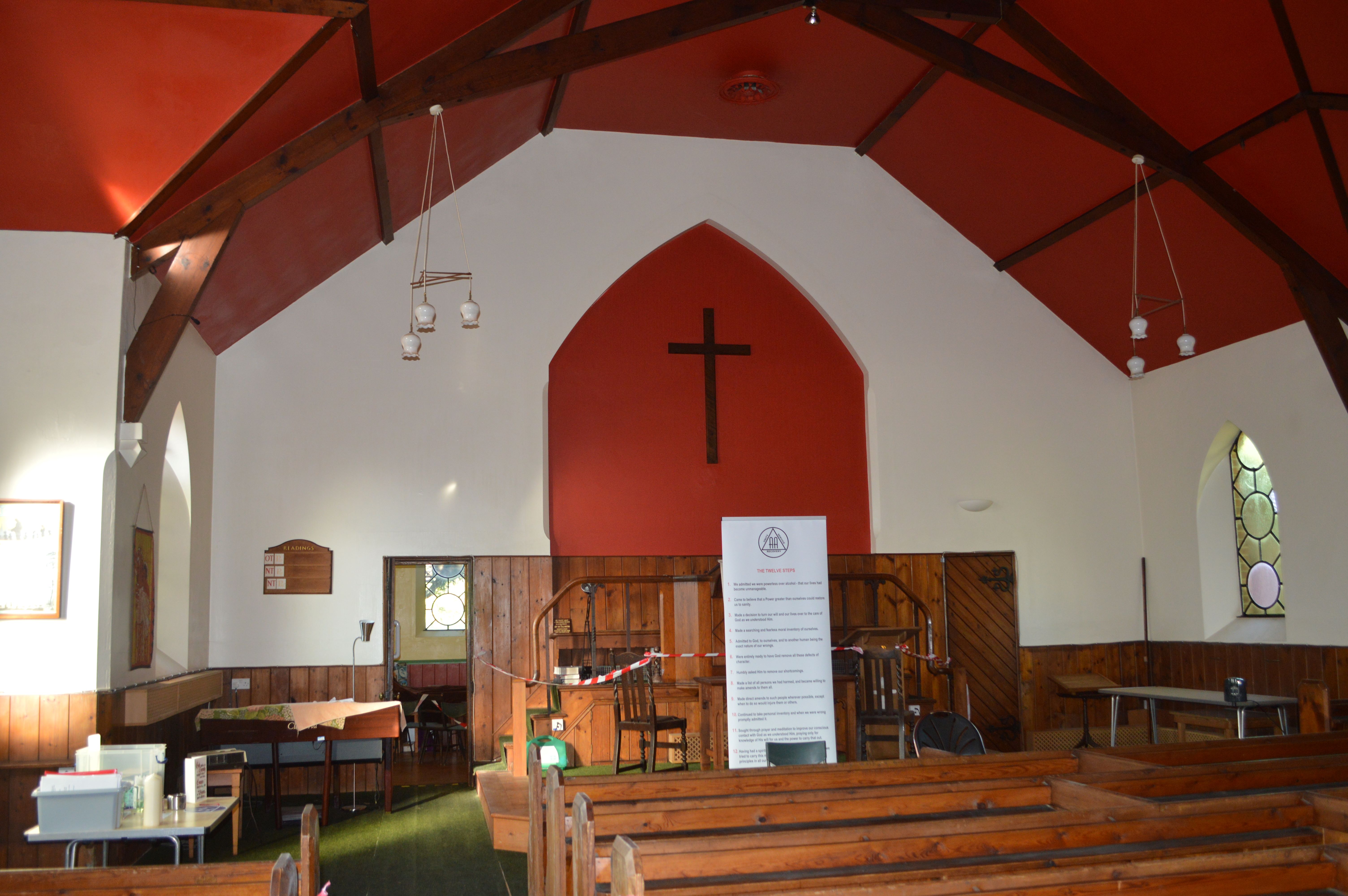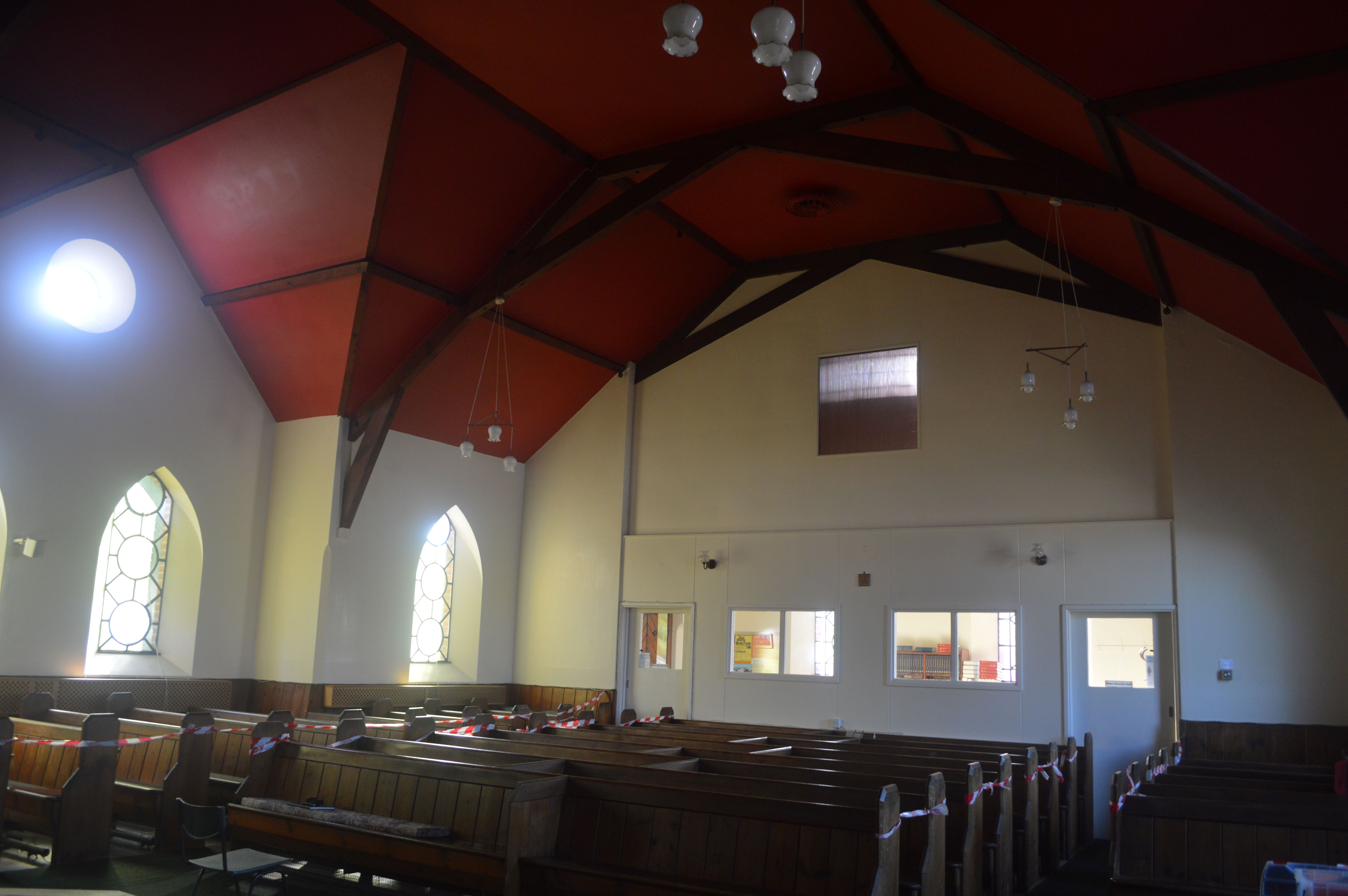 Internally, the church contains a number of rooms, there is a front entrance hall with loft and spire above, a main church, rear hall accessed from the church, kitchen, vestry, male / female / disabled toilets, along with access lobbies to the rear hall.