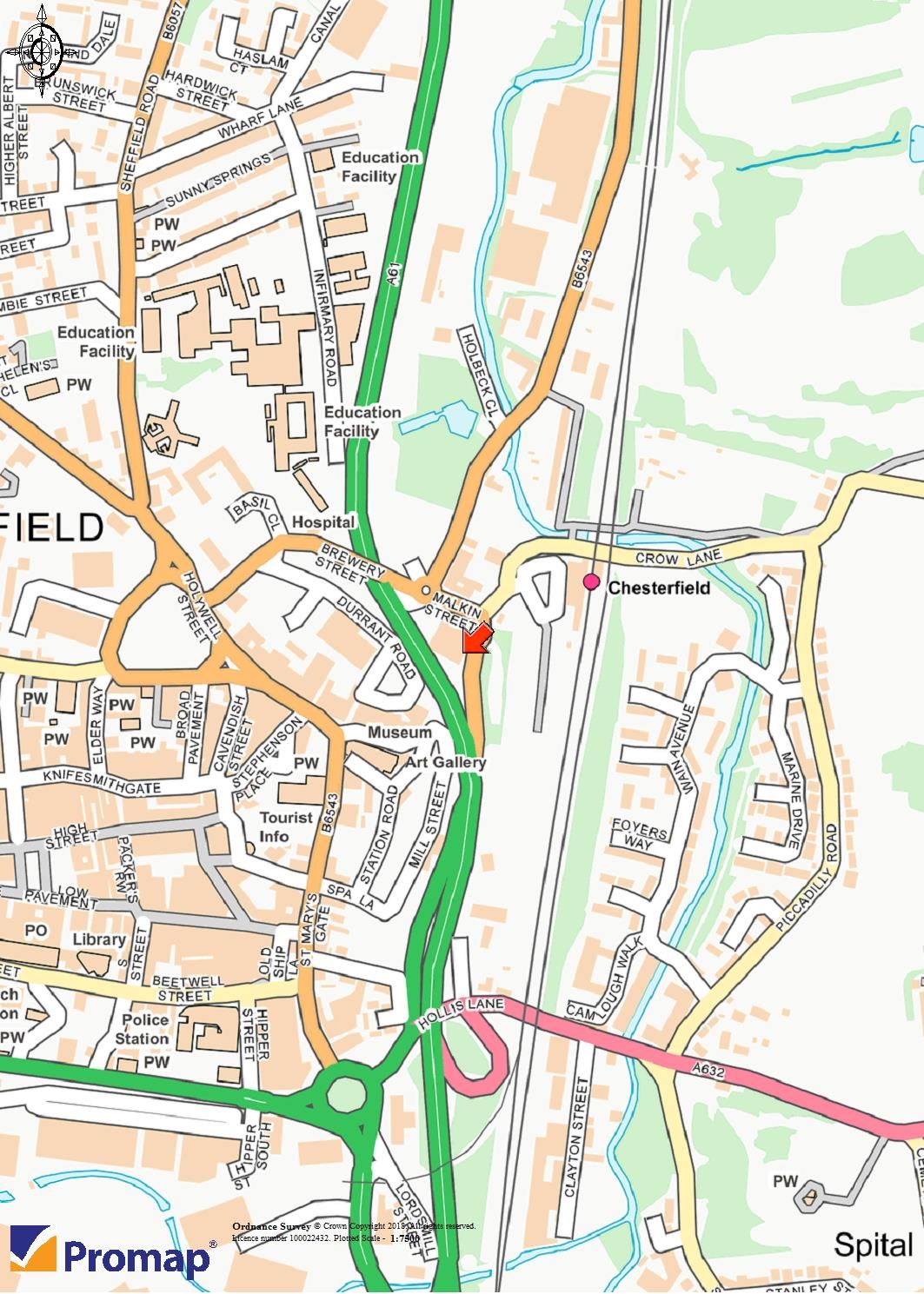 The property occupies a prominent block upon the edge of the town centre, fronting Malkin Street, and facing the main rail station. The property lies alongside and overlooking the A61 with a pedestrian footbridge link into the centre. The hotel car park is currently on a temporary letting, and there is an aerial tower on the roof. The proposed Chesterfield Waterside scheme will lie opposite the property.